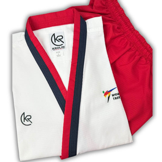 KROLIN AERODRY – Taekwondo Uniform Red & Black V-Neck (WT Approved, 100% Polyester)